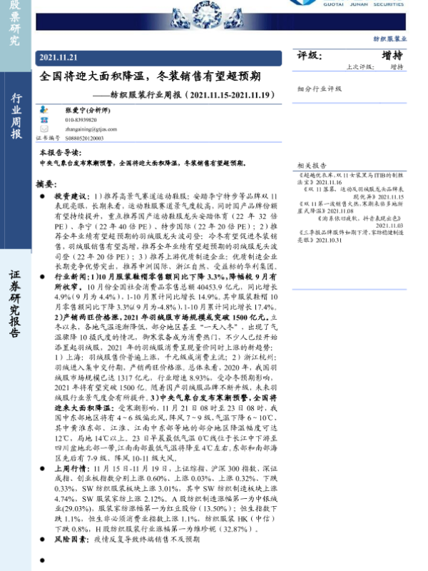 【国泰君安证券】【20211121】20211121-国泰君安-纺织服装行业周报:全国将迎大面积降温,冬装销售有望超预期-14页 行业研究