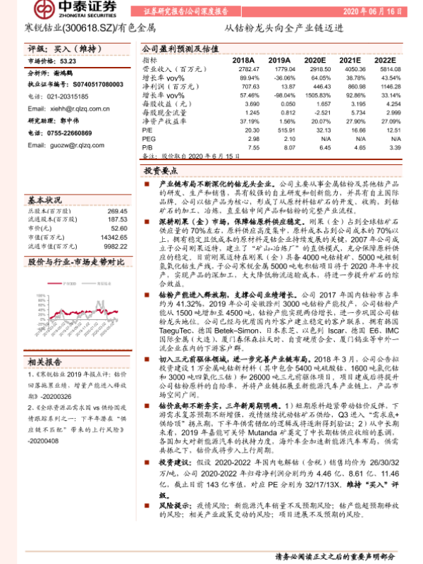 【中泰证券】【20200616】寒锐钴业-从钴粉龙头向全产业链迈进-26页 行业研究