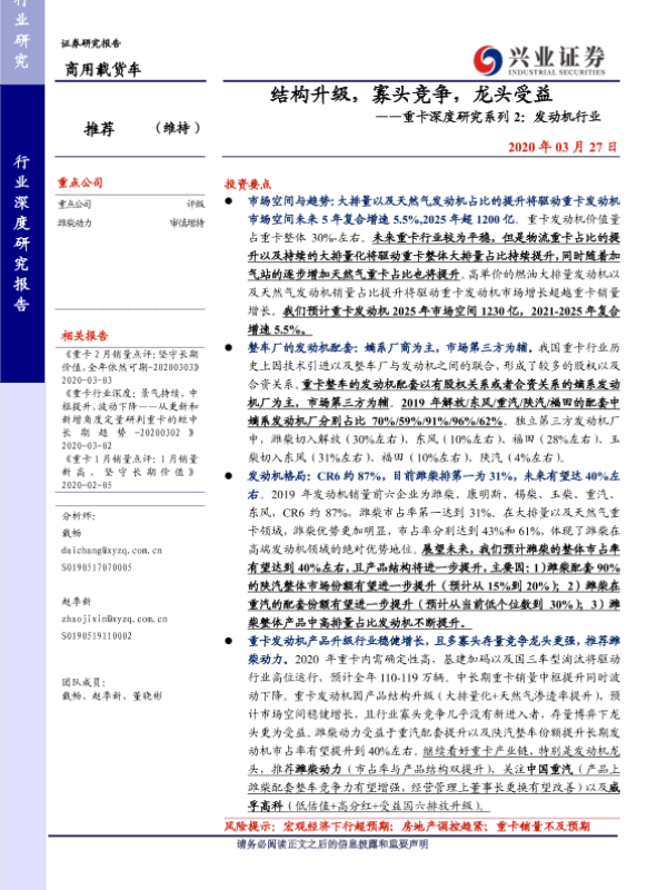 【兴业证券】【20200327】结构升级,寡头竞争,龙头受益——重卡深度研究系列2:发动机行业-27页 行业研究