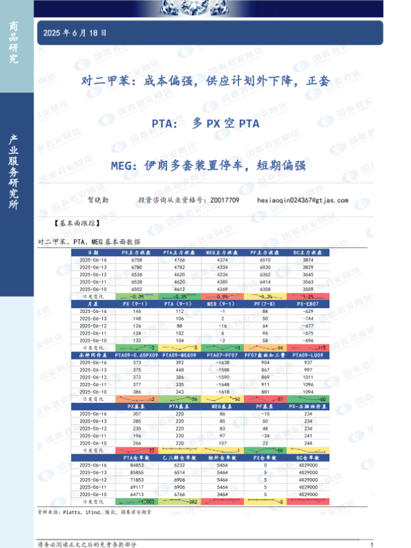 【国泰君安期货】【20250618】对二甲苯_成本偏强_供应计划外下降_正套_PTA_多PX空PTA_MEG_伊朗多套装置停车_短期偏强-4页 证券期货研究报告