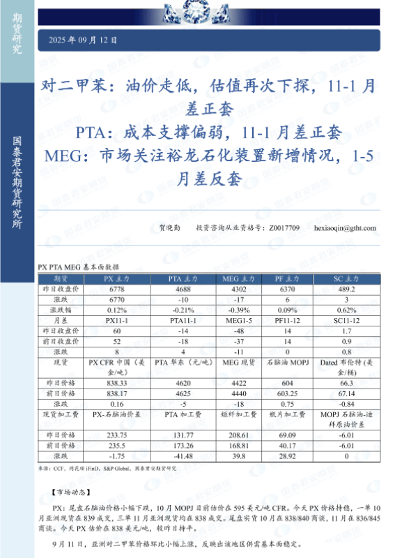 【国泰君安期货】【202509】对二甲苯:油价走低,估值再次下探,11-1月差正套 PTA:成本支撑偏弱,11-1月差正套 MEG:市场关注裕龙石化装置新增情况,1-5月差反套-4页 证券期货研究报告