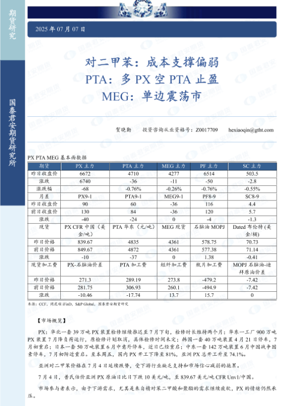 【国泰君安期货】【20250707】对二甲苯:成本支撑偏弱 PTA:多 PX空 PTA止盈 MEG:单边震荡市-3页 证券期货研究报告