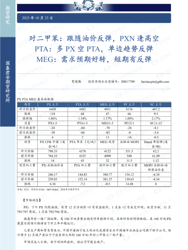 【国泰君安期货】【202510】对二甲苯:跟随油价反弹,PXN逢高空 PTA:多 PX空 PTA,单边趋势反弹 MEG:需求预期好转,短期有反弹-3页 证券期货研究报告