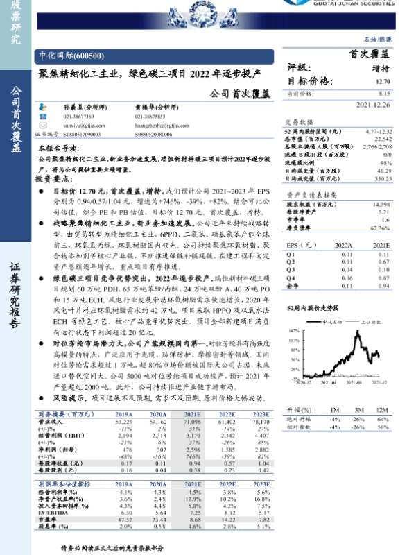 【国泰君安证券】【20211226】中化国际(600500)聚焦精细化工主业,绿色碳三项目2022年逐步投产-20页 行业研究