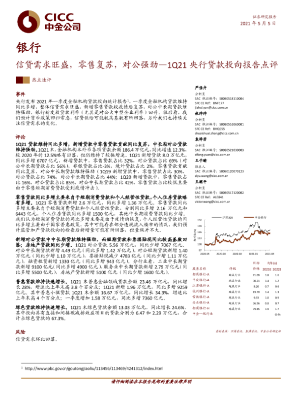 【中金公司】【20210505】1Q21央行贷款投向报告点评:信贷需求旺盛,零售复苏,对公强劲-8页 行业研究