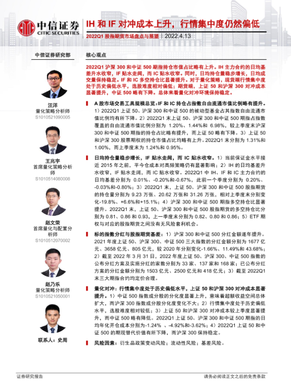【中信证券】【20220413】2022Q1股指期货市场盘点与展望:IH和IF对冲成本上升,行情集中度仍然偏低-20页 行业研究