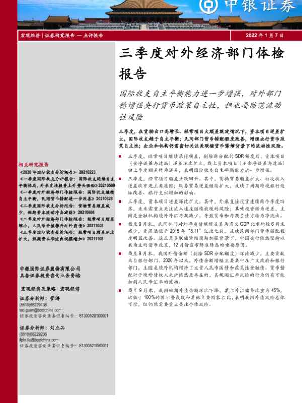 【中银证券】【20220107】三季度对外经济部门体检报告:国际收支自主平衡能力进一步增强,对外部门稳增强央行货币政策自主性,但也要防范流动性风险-15页 行业研究