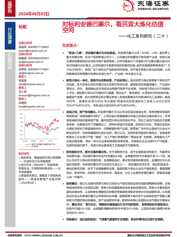 【东海证券】【20240603】对标利安德巴塞尔,看民营大炼化估值空间-18页 行业研究