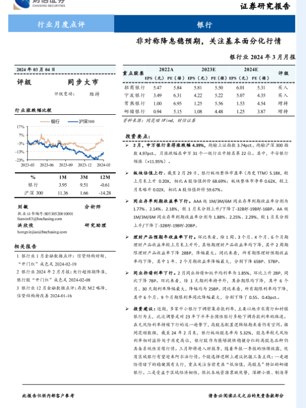 【财信证券】【20240304】银行业2024年3月月报:非对称降息稳预期,关注基本面分化行情-8页 行业研究