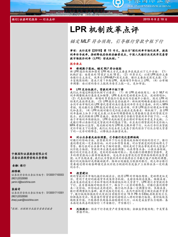 【中银证券】【20190818】LPR机制改革点评:锚定MLF符合预期,引导银行贷款中枢下行-8页 行业研究