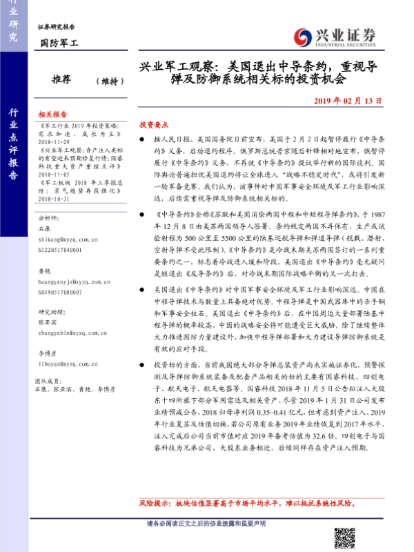 【兴业证券】【20190213】兴业军工观察:美国退出中导条约,重视导弹及防御系统相关标的投资机会-6页 行业研究