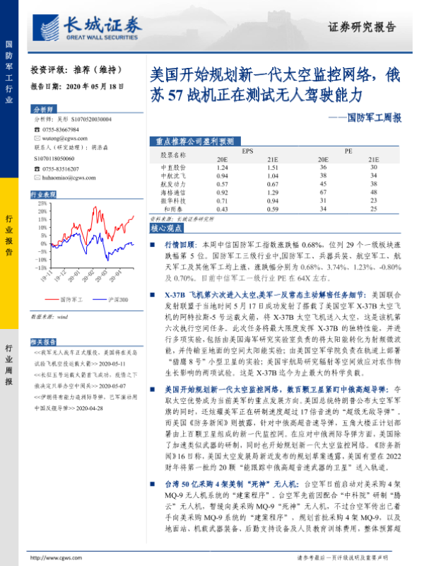 【长城证券】【20200518】20200518-长城证券-国防军工周报:美国开始规划新一代太空监控网络,俄苏57战机正在测试无人驾驶能力-12页 行业研究