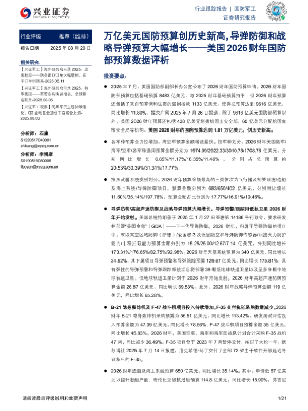 【兴业证券】【20250820】美国2026财年国防部预算数据评析-万亿美元国防预算创历史新高,导弹防御和战略导弹预算大幅增长-21页 证券期货研究报告
