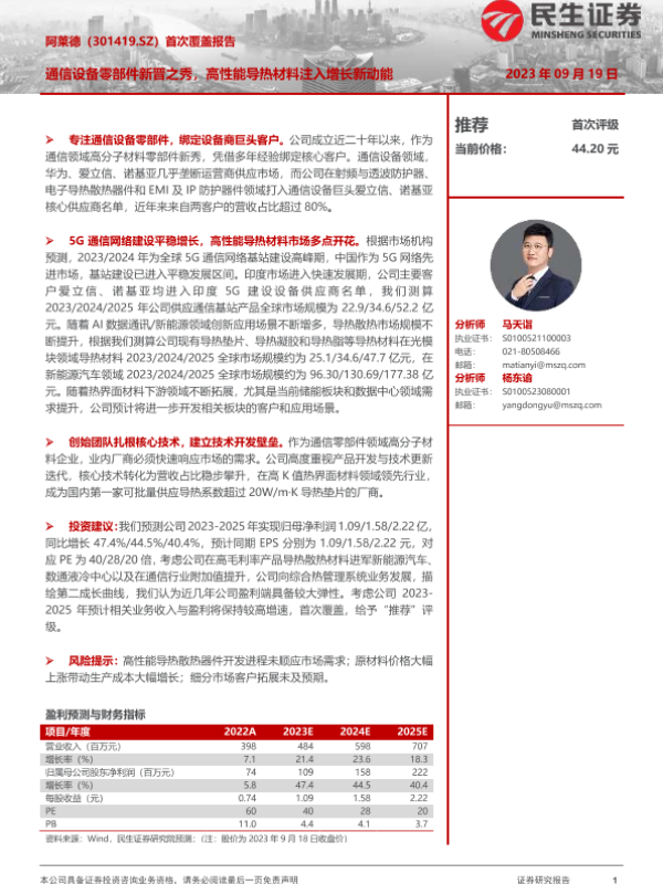 【民生证券】【20230919】阿莱德(301419.SZ)首次覆盖报告:通信设备零部件新晋之秀,高性能导热材料注入增长新动能-37页 行业研究