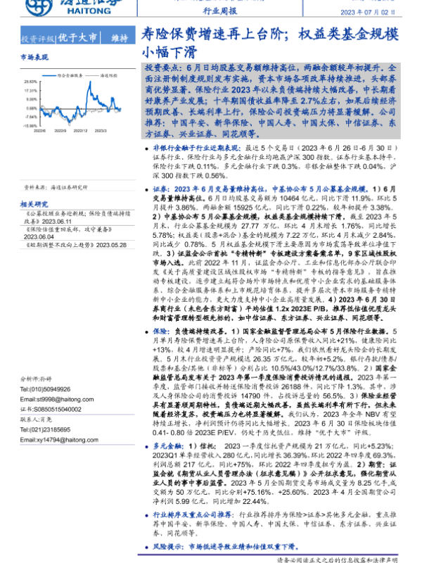 【海通证券】【20230702】综合金融服务行业周报:寿险保费增速再上台阶;权益类基金规模小幅下滑-10页 行业研究