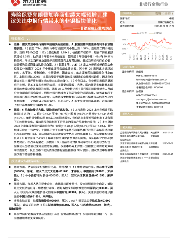 【东方证券】【20230716】非银金融行业周观点:寿险保费亮眼叠加券商业绩大幅预增,建议关注中报行情带来的非银板块催化-14页 行业研究