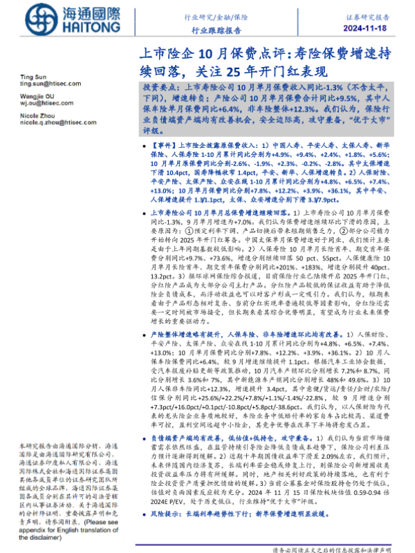 【海通国际】【20241118】上市险企10月保费点评:寿险保费增速持续回落,关注25年开门红表现-12页 行业研究