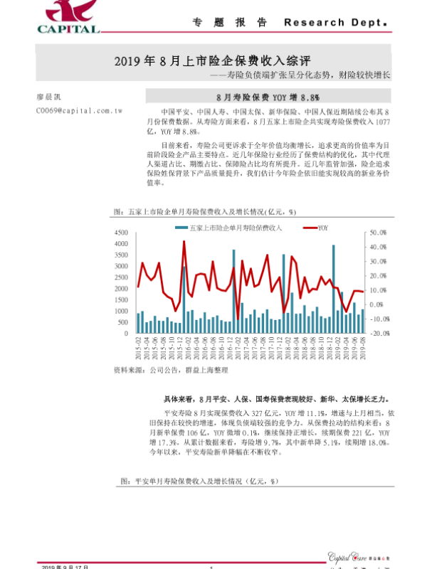 【群益证券】【20190917】2019年8月份上市险企保费收入综评:寿险负债端扩张呈分化态势,财险较快增长-8页 行业研究