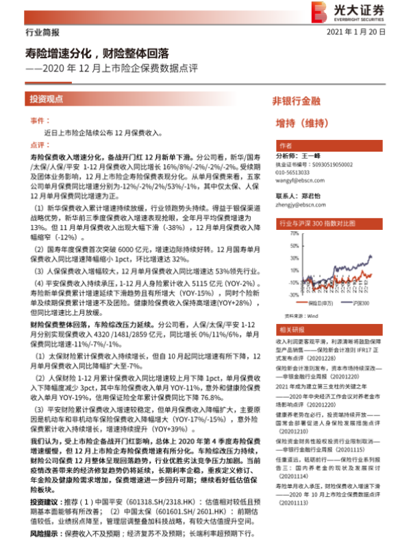 【光大证券】【20210120】2020年12月上市险企保费数据点评-3页 行业研究