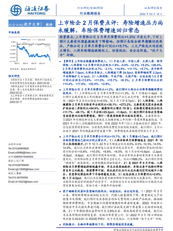 【海通证券】【20220316】上市险企2月保费点评:寿险增速压力尚未缓解,车险保费增速回归常态-5页 行业研究