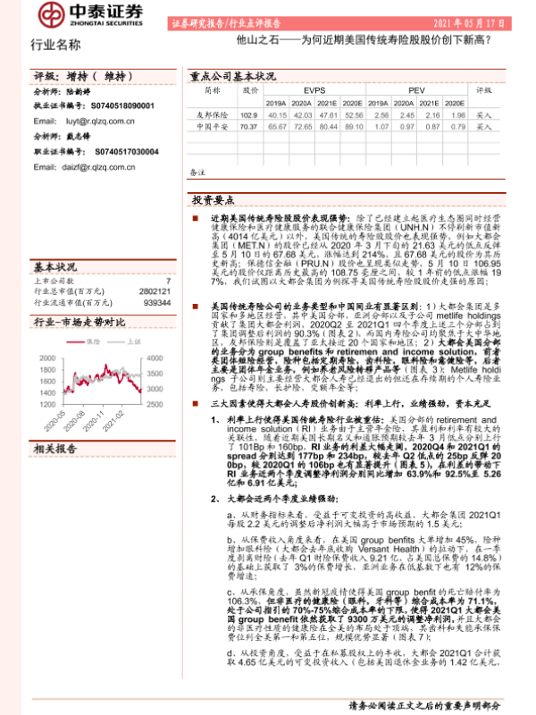 【中泰证券】【20210517】他山之石——为何近期美国传统寿险股股价创下新高?-6页 行业研究
