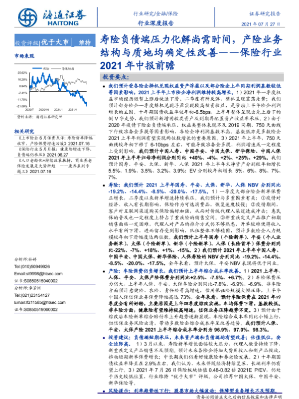 【海通证券】【20210727】保险行业2021年中报前瞻:寿险负债端压力化解尚需时间,产险业务结构与质地均确定性改善-17页 行业研究