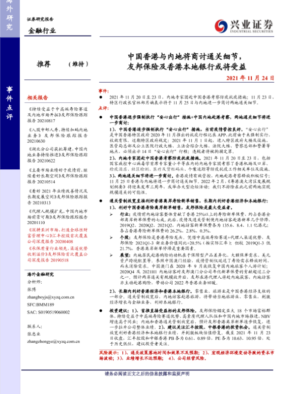 【兴业证券】【20211124】中国香港与内地将商讨通关细节,友邦保险及香港本地银行或将受益-6页 行业研究