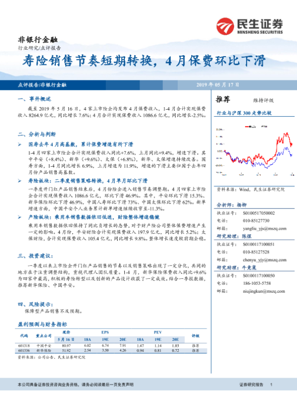 【民生证券】【20190517】寿险销售节奏短期转换,4月保费环比下滑-6页 行业研究