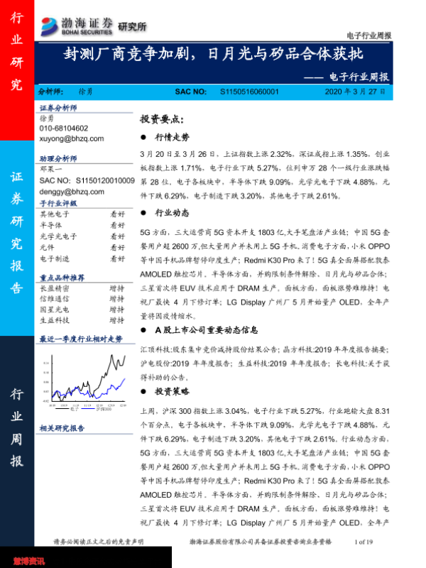 【渤海证券】【20200327】电子行业周报:封测厂商竞争加剧,日月光与矽品合体获批-19页 行业研究