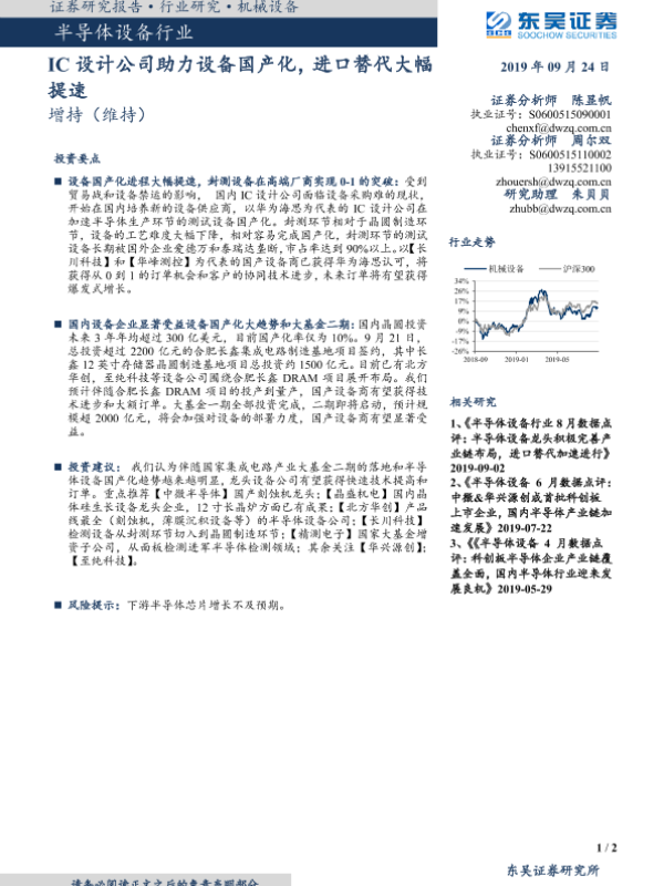 【东吴证券】【20190924】半导体设备行业:IC设计公司助力设备国产化,进口替代大幅提速-2页 行业研究