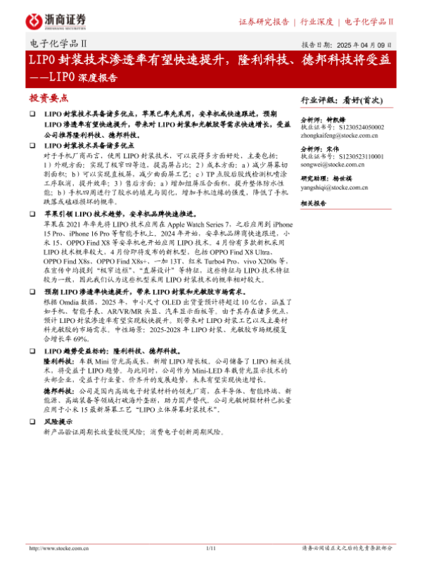 【浙商证券】【20250409】电子化学品行业LIPO深度报告:LIPO封装技术渗透率有望快速提升,隆利科技、德邦科技将受益-11页 证券期货研究报告