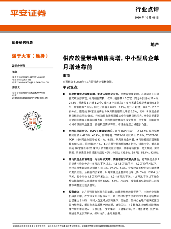 【平安证券】【20201008】地产行业点评:供应放量带动销售高增,中小型房企单月增速靠前-5页 证券期货研究报告
