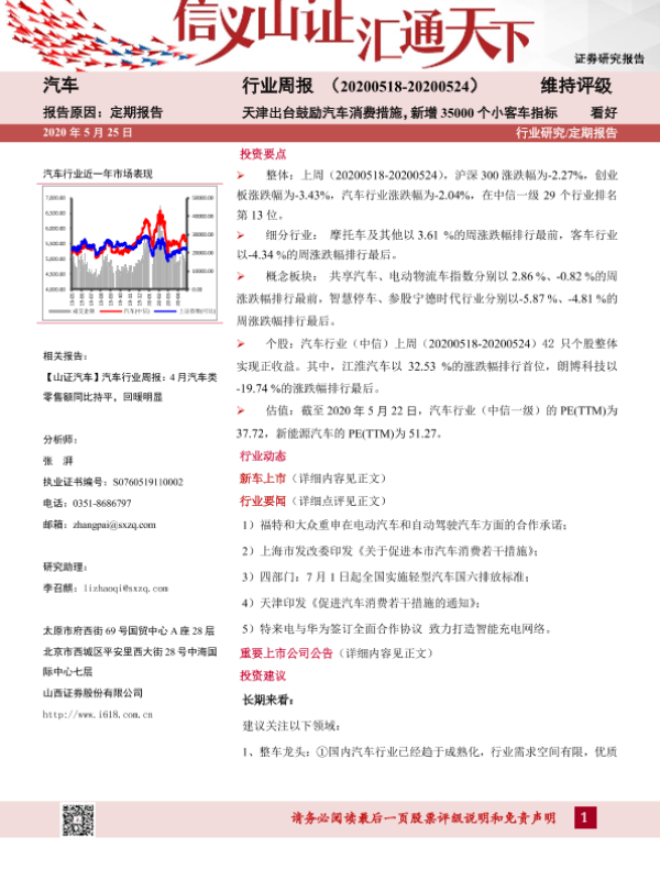 【山西证券】【20200525】20200525-山西证券-汽车行业周报:天津出台鼓励汽车消费措施,新增35000个小客车指标-16页 行业研究