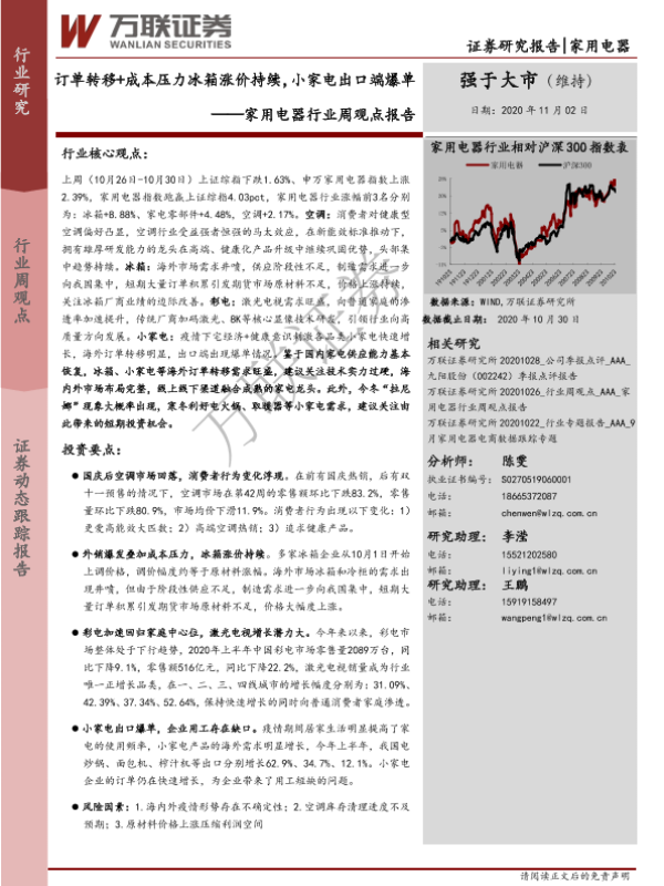 【万联证券】【20201102】20201102-万联证券-家用电器行业周观点报告:订单转移+成本压力冰箱涨价持续,小家电出口端爆单-16页 行业研究