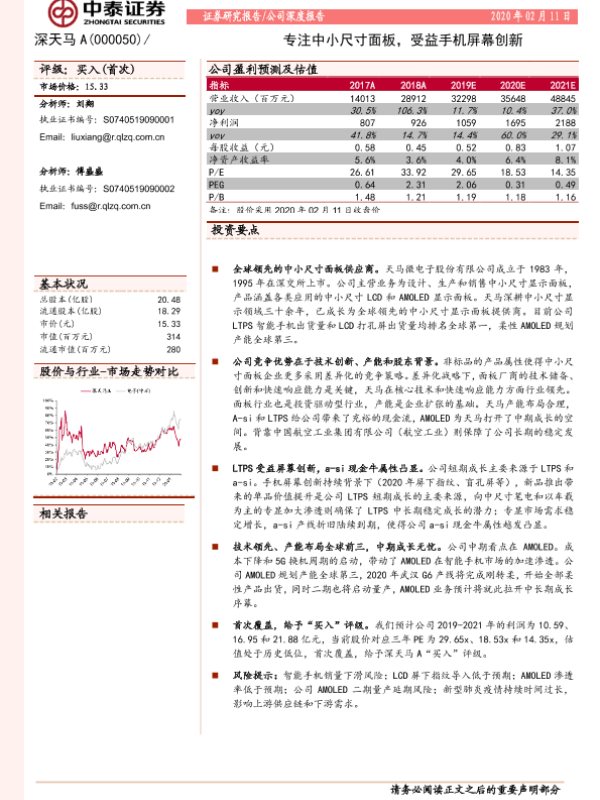 【中泰证券】【20200211】20200211-中泰证券-深天马A-000050.SZ-专注中小尺寸面板,受益手机屏幕创新-19页 行业研究