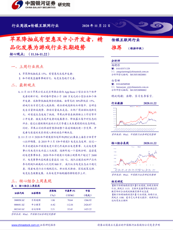 【银河证券】【20201122】中国银河-传媒互联网行业周报:苹果降抽成有望惠及中小开发者,精品化发展为游戏行业长期趋势-36页 行业研究