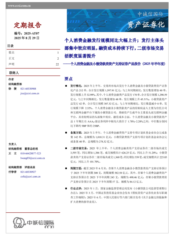 【中诚信国际】【202508】个人消费金融及小微贷款类资产支持证券产品报告(2025年半年度)-22页 证券期货研究报告