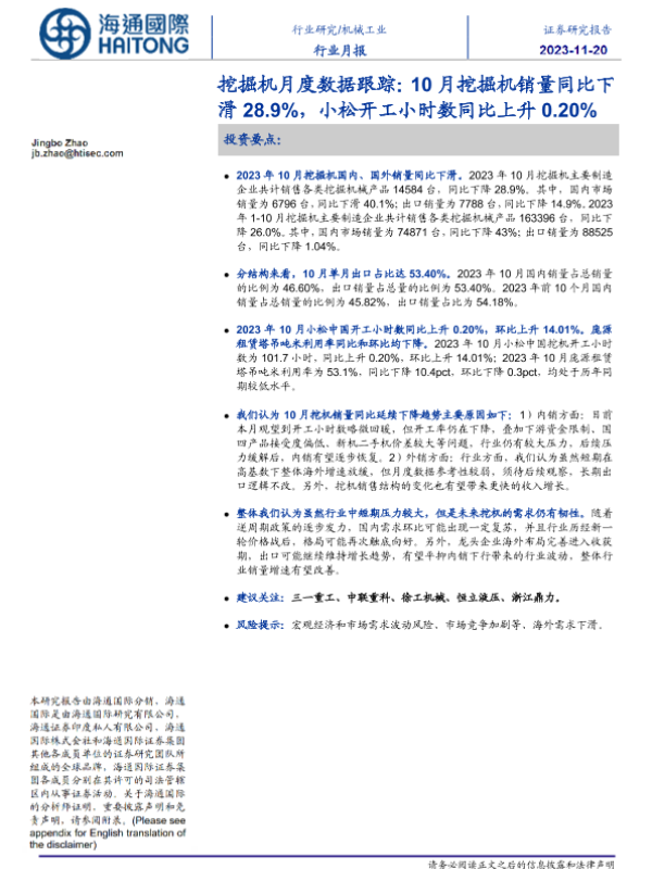 【海通国际】【20231120】20231120-海通国际-挖掘机月度数据跟踪:10月挖掘机销量同比下滑28.9%,小松开工小时数同比上升0.20%-10页 行业研究