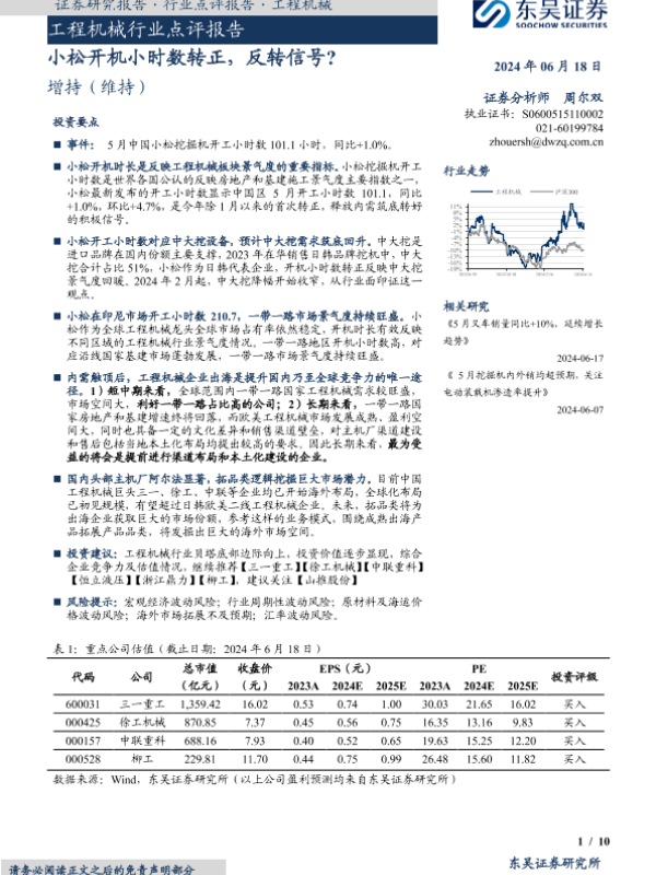 【东吴证券】【20240618】20240618-东吴证券-工程机械行业点评报告:小松开机小时数转正,反转信号?-10页 行业研究