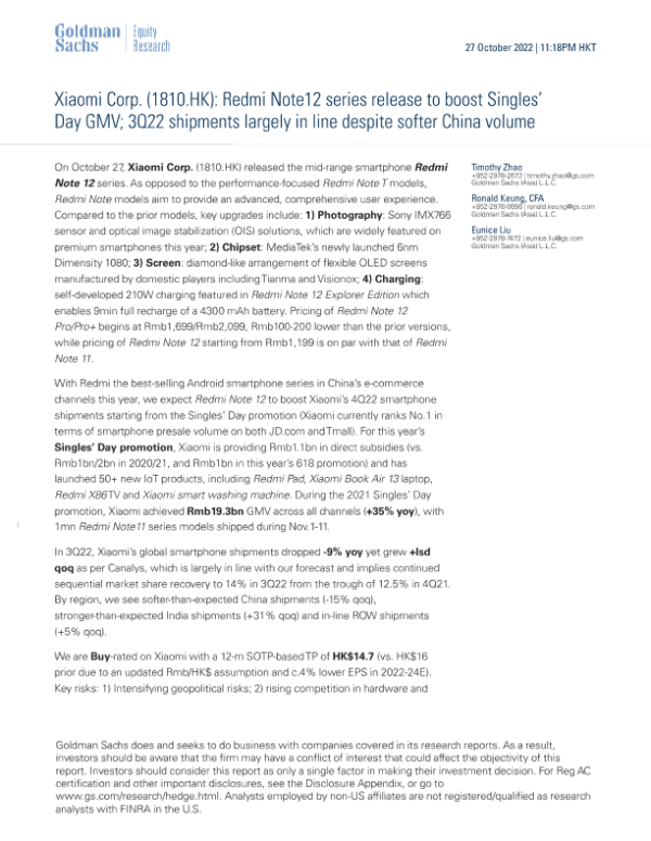 【Goldman Sachs】【20221027】Xiaomi Corp.(1810.HK) Redmi Note12系列发布将推动双十一GMV;2022年第三季度出货量大致符合预期,尽管中国市场销量疲软-9页 行业研究