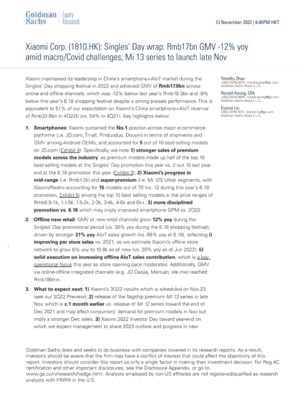 【Goldman Sachs】【20221113】GMV -12% yoy amid macro_Covid challenges; Mi 13 series to launch late Nov-10页 行业研究
