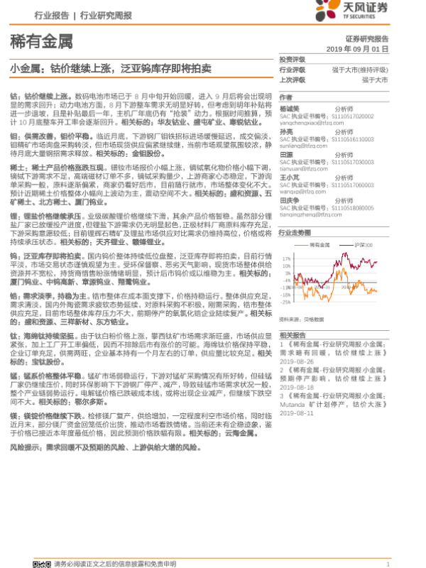 【天风证券】【20190901】20190901-天风证券-小金属行业研究周报:钴价继续上涨,泛亚钨库存即将拍卖-16页 行业研究