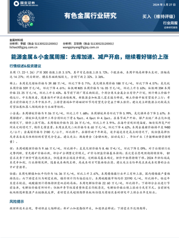 【国金证券】【20240127】20240127-国金证券-能源金属&小金属周报:去库加速、减产开启,继续看好锑价上涨-17页 行业研究