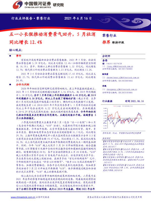 【银河证券】【20210616】五一小长假推动消费景气回升,5月社消同比增长12.4%-5页 行业研究