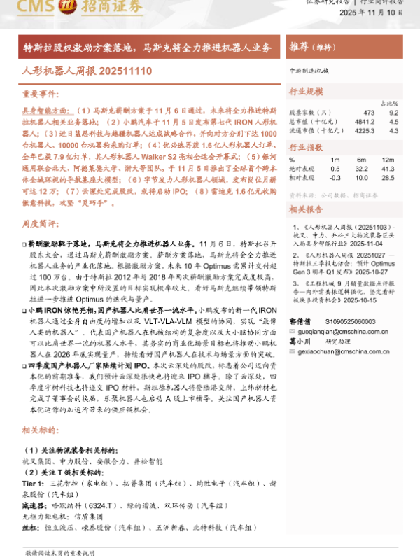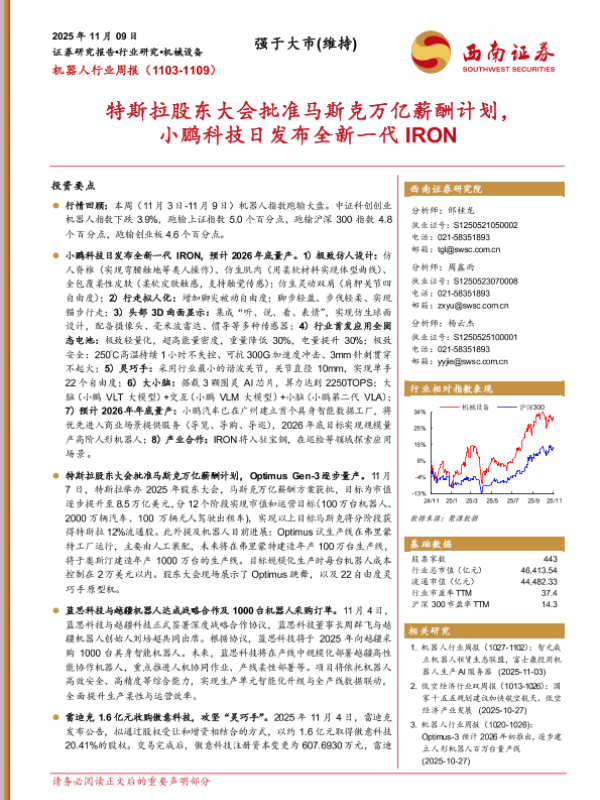 【西南证券】【202511】机器人行业周报:特斯拉股东大会批准马斯克万亿薪酬计划,小鹏科技日发布全新一代IRON-11页 证券期货研究报告