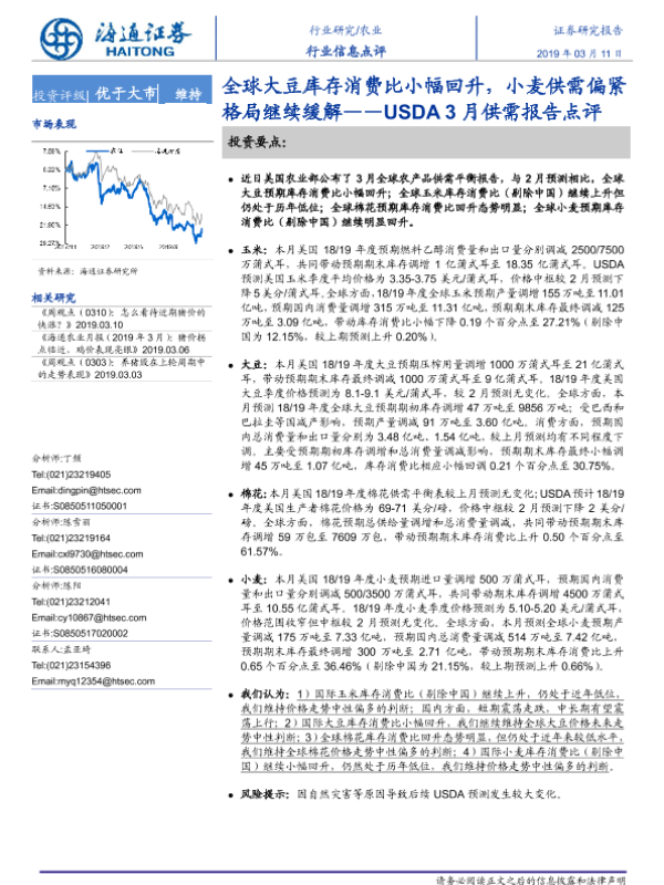 【海通证券】【20190311】20190311-海通证券-农业行业信息点评:USDA3月供需报告点评-全球大豆库存消费比小幅回升,小麦供需偏紧格局继续缓解-7页 行业研究