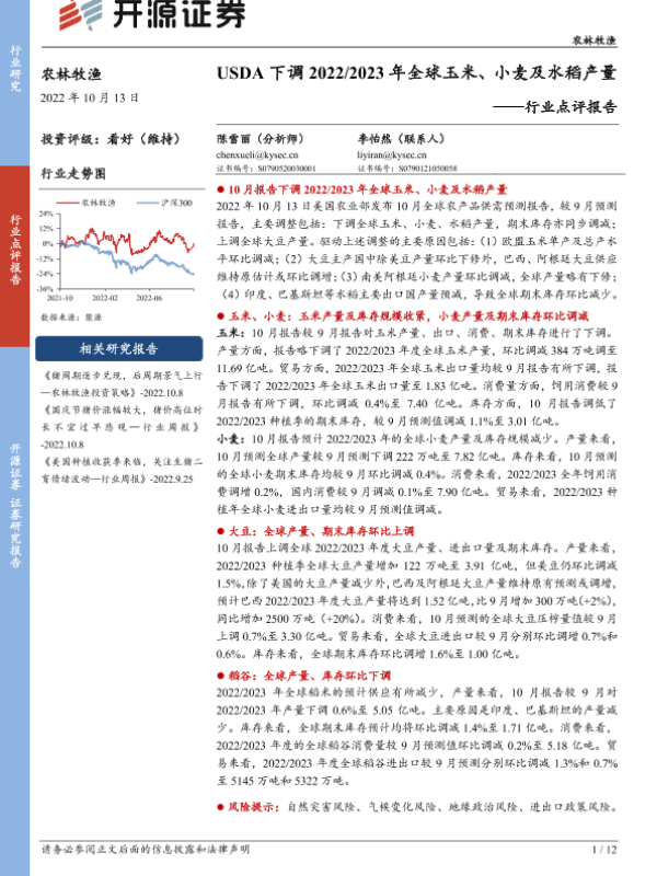 【开源证券】【20221013】USDA下调2022 2023年全球玉米、小麦及水稻产量-12页 证券期货研究报告