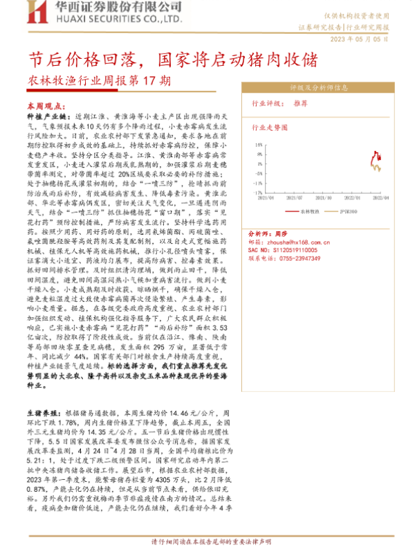 【华西证券】【20230505】20230505-华西证券-农林牧渔行业周报第17期:节后价格回落,国家将启动猪肉收储-26页 行业研究