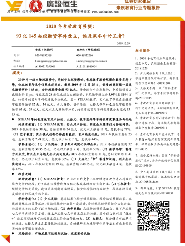 【广证恒生】【20191229】2020年素质教育行业展望:93亿145起投融资事件盘点,谁是寒冬中的王者?-24页 证券期货研究报告