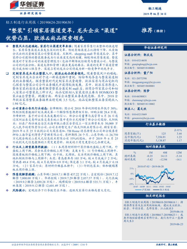 【华创证券】【20190630】20190630-华创证券-轻工制造行业周报:“整装”引领家居渠道变革,龙头企业“渠道”优势凸显,欧派&尚品探索领先-12页 行业研究